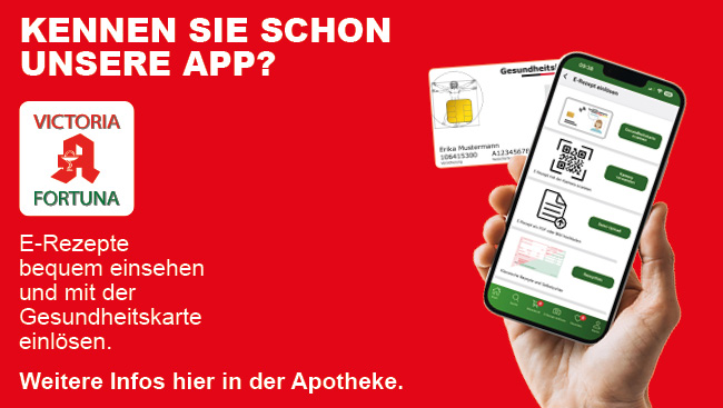 Alle Texte, Bilder, Marken, Dateien und weitere hier veröffentlichte Informationen unterliegen dem Copyright der VICTORIA APOTHEKE, Lahnstein, bzw. den Rechteinhabern bei Beiträgen/Darstellungen aus anderen Quellen. Eine Reproduktion oder Weitergabe des Ganzen oder von Teilen ist ohne schriftliche Zustimmung der VICTORIA APOTHEKE, Lahnstein, nicht gestattet.